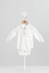 肌に優しい柔らかなオーガニックコットンを使用したフォーマルロンパース。胸元の立体ピンタックがクラシックなシャツデザインを演出し、前立てスナップボタンで着脱もラクチン。袖口のテープ縁取りはまるでミニリボンのように、可愛らしさと上品さをプラス。特別な日にも、普段のおしゃれにも、赤ちゃんの品のある雰囲気を引き立てます。